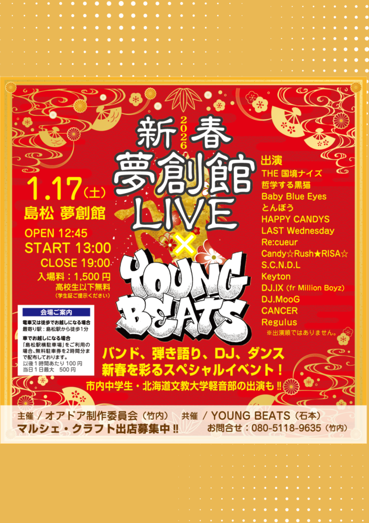 2026年イベントバンド、引き語り、DJ、ダンス 新春 夢創館 LIVE~YOUNG BEATS~【2026年1月17日(土)】 お知らせ information 過去の記事 Faceboo […] シェアよろしくお願いします!