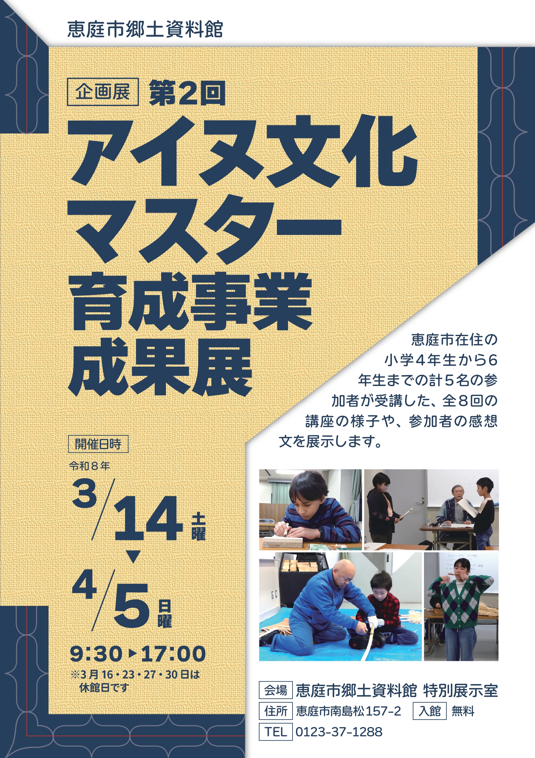 3月 14 @ 9:30 AM - 4月 5 @ 5:00 PM 第2回 アイヌ文化マスター育成事業成果展【2026年3月14日(土)~4月5日(日) 恵庭市郷土資料館】 恵庭市郷土資料館 南島松157-2 恵庭市 北海道 Japan 催事 恵庭市郷土資料館 企 […]