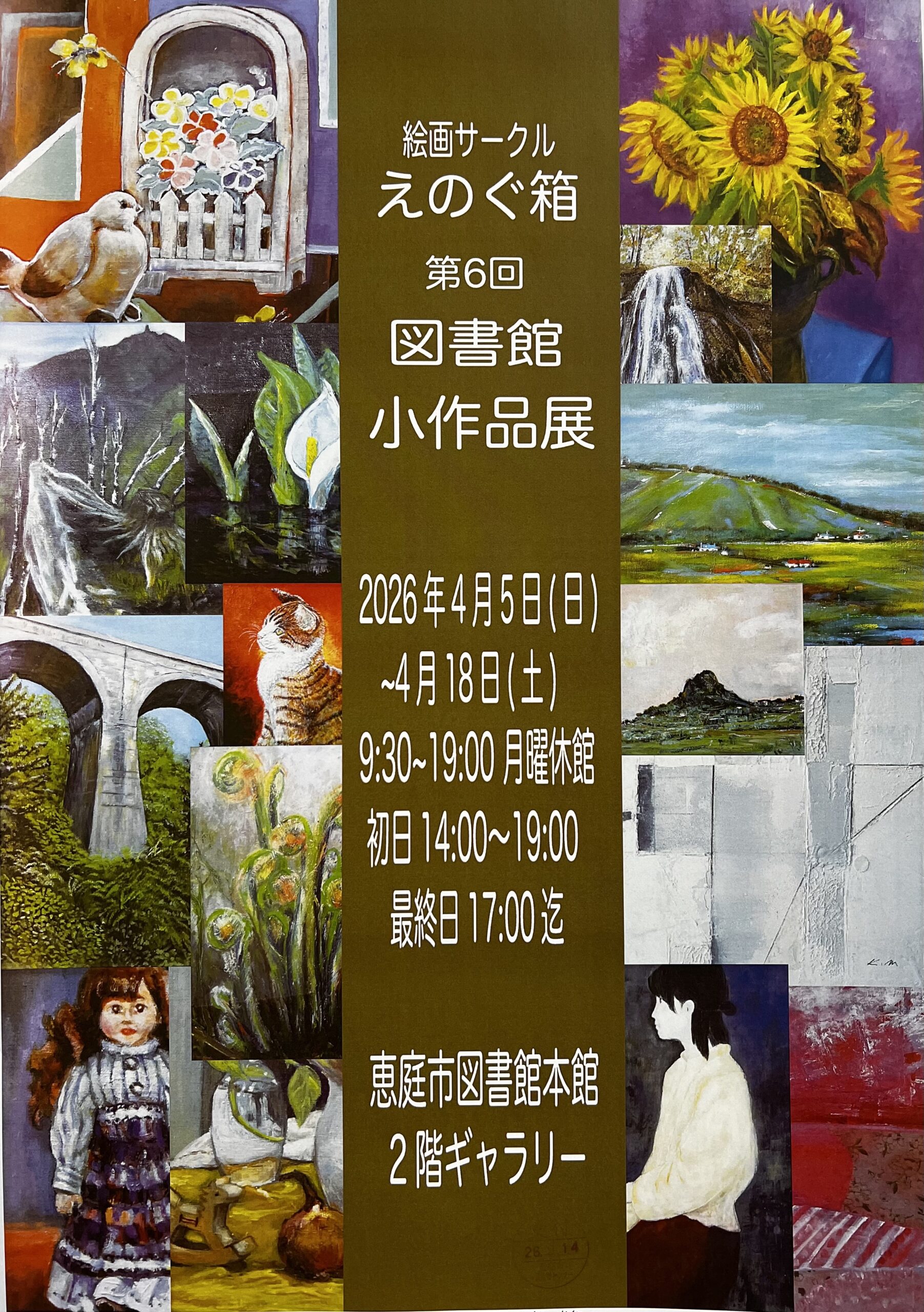 4月 5 @ 2:00 PM - 4月 18 @ 5:00 PM 絵画サークルえのぐ箱 第6回小作品展 【2026年4月5日(日)~4月18日(土) 図書館本館2階ギャラリー】 恵庭市立図書館本館 催事 絵画サークルえのぐ箱 […]